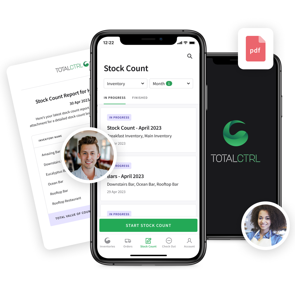 TotalCtrl mobile app interface - share report, pdf stock count report